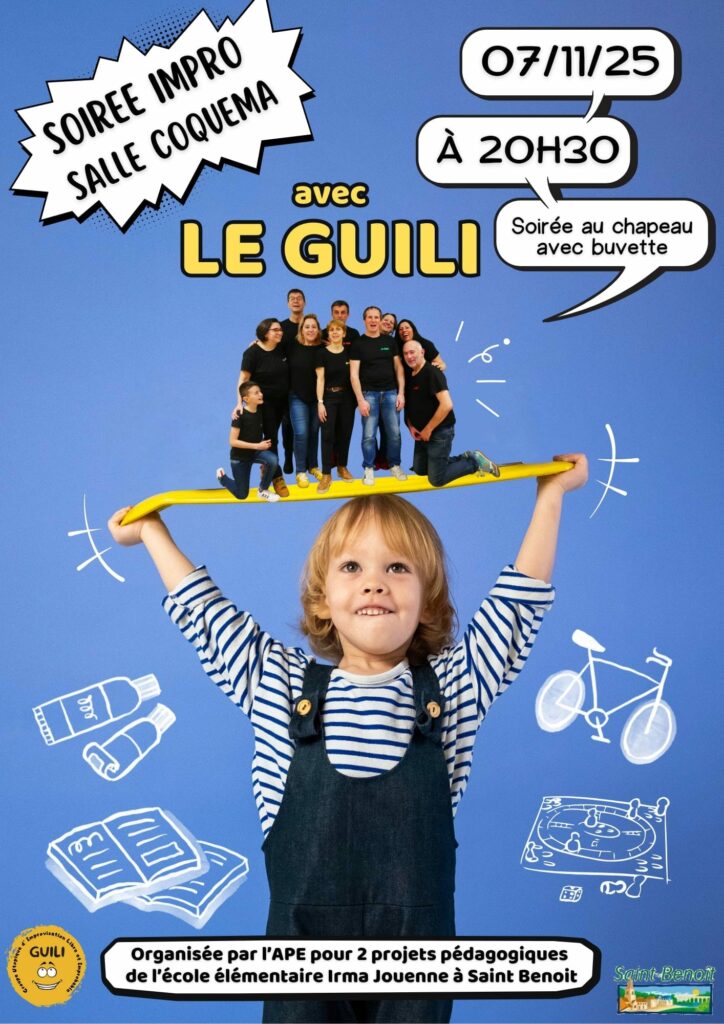 Vendredi 7 novembre à 20h30 à la Salle Coquema de la Varenne, l’APE Irma Jouenne vous propose une soirée Impro avec la troupe d’improvisation du Guili pour soutenir financièrement les projets pédagogiques de l’école élémentaire Irma Jouenne.